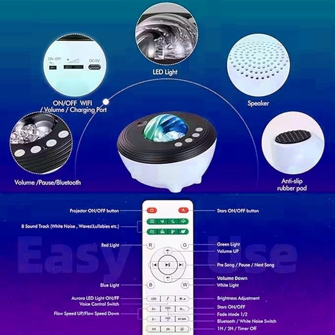 - SMART AURORA PROJECTOR NIGHT LIGHT : This Aurora projector integrates an aurora projector, night light, Bluetooth speaker, and white noise machine into one device. Now equipped with dual projection lenses, it can project 15 types of aurora and vibrant starry skies, creating a relaxing atmosphere with soothing music to let you enjoy the beauty of nature. Transform your room into a beautiful, romantic gateway with serene and captivating lights.