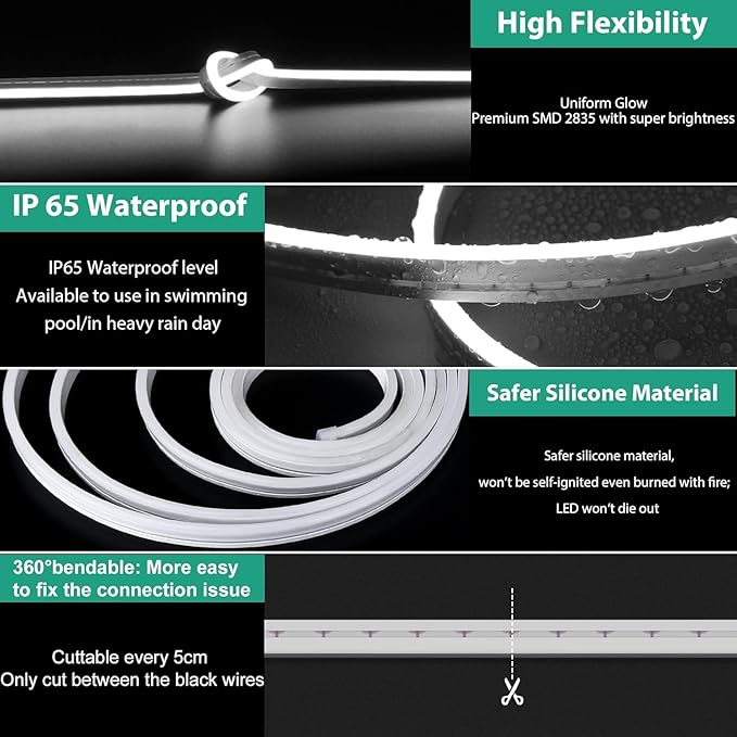- 【STURDY & LONG-LASTING& SAFE】-The White LED Strip has been made using long-lasting components Pretty Suitable for Lighting and Decoration. It meets your need for Home Decor or any Business Usage. This Flexible LED Neon Rope Light Works with 24V Direct Current which Makes it Low Heat. So it is Touchable for Kids and Adults.