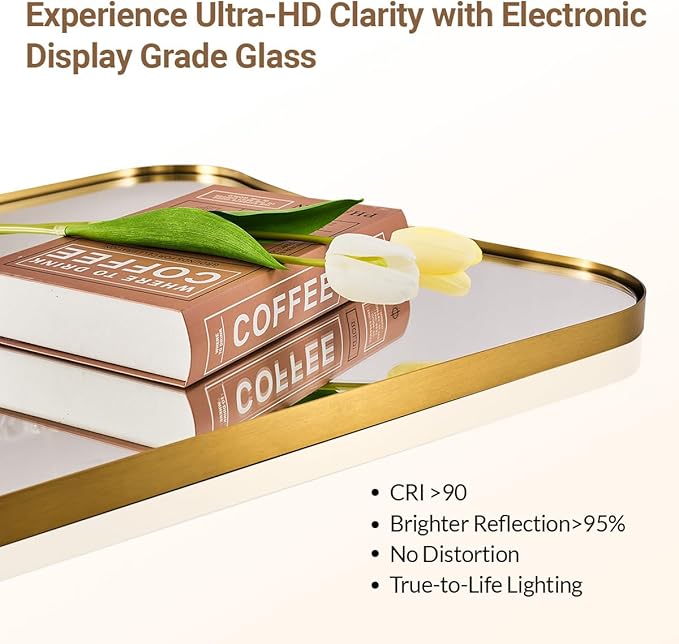 - 【Premium Stainless Steel Craftsmanship】: (N.W:19.18LBS). Crafted from stainless steel metal with oxidation-resistant properties, this mirror for bathroom offers enhanced stability and a longer lifespan. Shatterproof 4mm HD glass is supported by a 9mm MDF backboard (most others just 3mm ), surrounded by a 1/17" gap with the unique curved corner design to give a seamless finish
