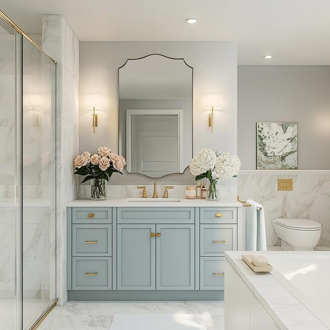 - 【High-Definition Clarity】:This bathroom vanity mirror features a crystal-clear reflection using high-quality silver glass, offering true-to-life images without distortion. The robust construction of our antique brass mirror ensures its longevity, while the easy-to-clean surface keeps your reflection pristine