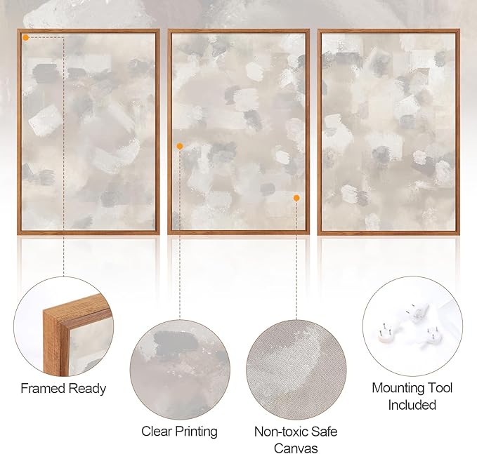 Abstract Gray Beige White Pastel Wall Art Set(16"x24"), 3 Pieces Neutral Geometric Strokes Shapes Illustration Framed Canvas Artwork, Large Mid Century Modern Minimalist Wall Decor for Office Bedroom Living Room
