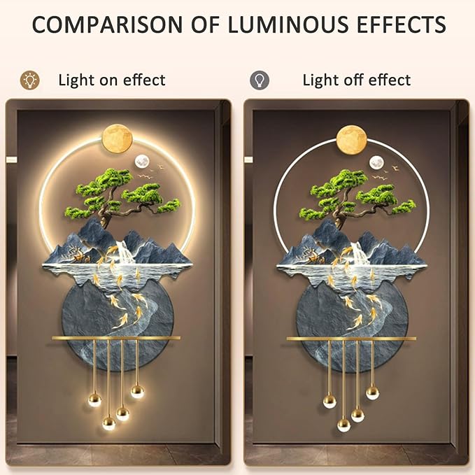 3D Art Wall Decor, Wall Sculptures Hanging Painting Koi Fish Welcoming Pine Wall Art Decoration Lamp,Oriental Decor Traditional Chinese Feng Shui Wall Hanging Painting,Wireless Remote Control