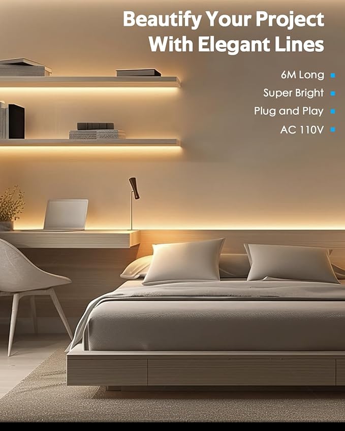 - 【With Switch Plug In】 AC 110-130V Input, High Density 288 LEDs/M, Total 1728 LEDs/6M, 8W/M, 3000K, CRI>85. 20FT warm white strip lights with switch plug, no need to connect additional adapters, Plug & Play, convenient for you to use. Compared with low voltage LED strips, high voltage LED light strip will not show brightness difference throughout the strip, which can meet your high brightness requirement for light decoration!