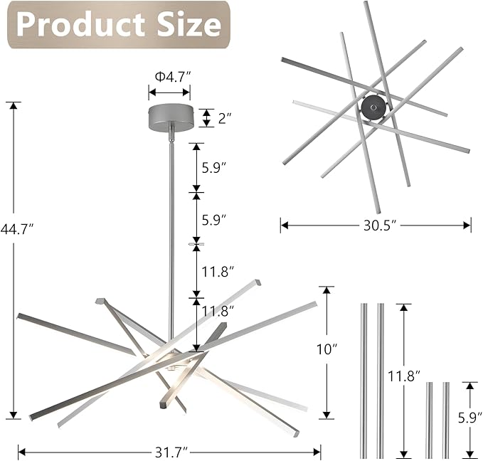 - 【DIY Styling Modern Chandelier】The black LED chandelier is composed of 6 x 31.7" light tubes, they are rotatable and can be adjusted to the style you want at any time. The simple and slim design gives this LED chandelier a more modern and elegant, look for dining room, living room, kitchen island, bedroom, foyer, and other indoor spaces.
