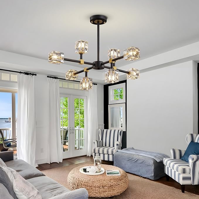 Black Sputnik Chandelier,Crystal Chandeliers with 8-Lights,Modern Semi Flush Mount Ceiling Light Fixture with Adjustable Height,Pendant Light Fixture for dining room,kitchen island,bedroom,living room