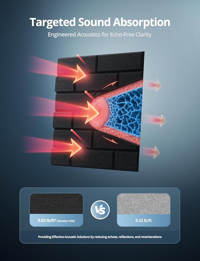 - Experience Better Audio: Acoustic panels reduce echo and reflections by absorbing stray sound waves in the room. Whether relaxing, recording, or gaming, our panels improve clarity and reduce noise, providing mild soundproofing for a calmer home.