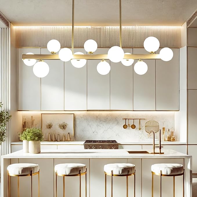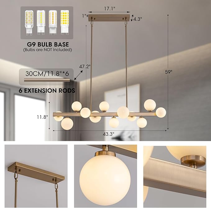 - 【Precise Dimensions】Spanning 43.3" in length and 11.8" in width, this gold globe flush mount ceiling light is perfectly sized to be the centerpiece in dining rooms, kitchens, or living areas. Its balanced proportions effortlessly enhance the ambiance of any setting.