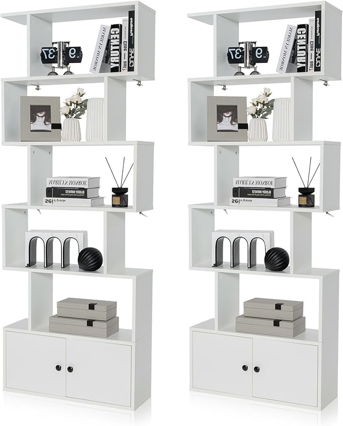 6-Tier Geometric Bookcase Set of 2, 72” Freestanding Room Divider Bookshelf with Open Display Shelves & Storage Cabinet, Wood S-Shaped Storage Organizer for Living Room, Bedroom & Home Office
