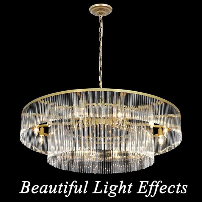 - 【Luxury Gold Chandelier】: Features a beautiful golden finish frame along with 2 layers clear glass rods, creating a dramatic play of light and a softly diffused glow. This large gold round glass chandelier is a statement piece that can transform the ambiance of any space.