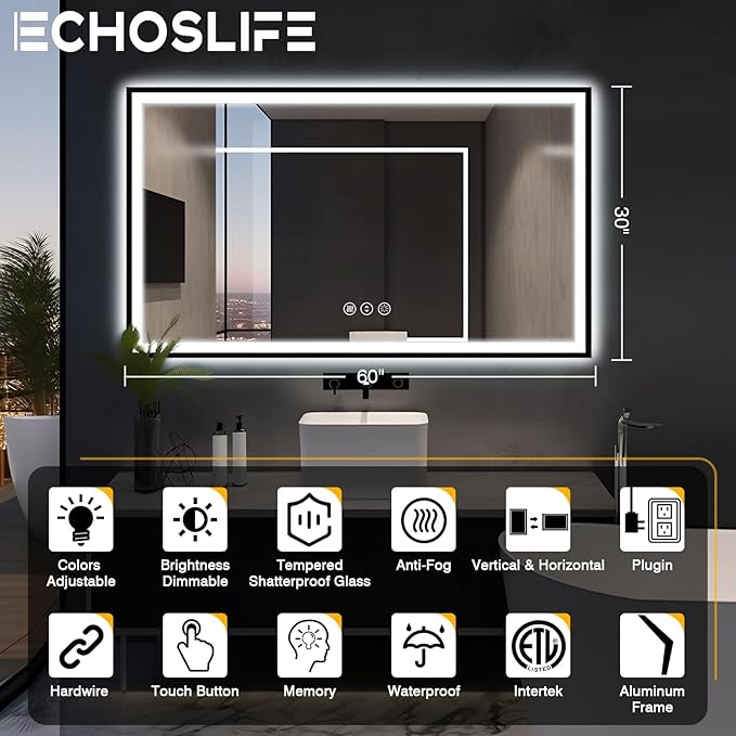 - [Space Black Aluminum Frame] Unlike other large LED bathroom mirrors, EchosLife's mirrors feature modern space black aluminum frames that create sophisticated atmospheres and add authentic touch of luxury.