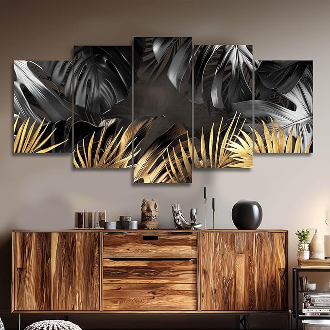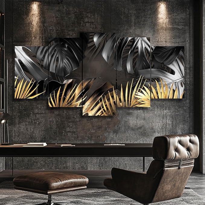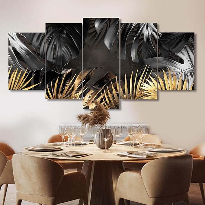 Black and Gold Leaves Painting Wall Decor for Living Room Nature Canvas Art Modern Artwork Framed Prints for Home Bedroom Picture Poster 5 Pieces Ready to Hang (12"x20"x2pcs+12"x28"x2pcs+12"x32")