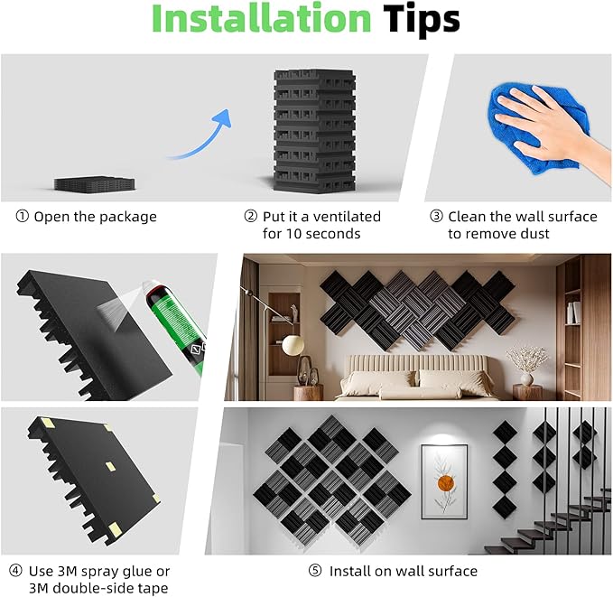 - Self-Adhesive Design - The acoustic panels have double-sided tape behind them. Easy to Install. Just rip down the first layer of double-sided tape, you can paste in wherever you want. We also match spare back glue for you, which can help you paste better.