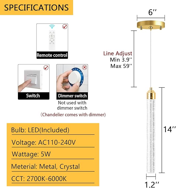 - Crystal chandelier come with 5W LED dimmable light source (dimmer included), can be used in volt AC110V/120V/220V/240V directly, remote control the lighting color and brightness changed