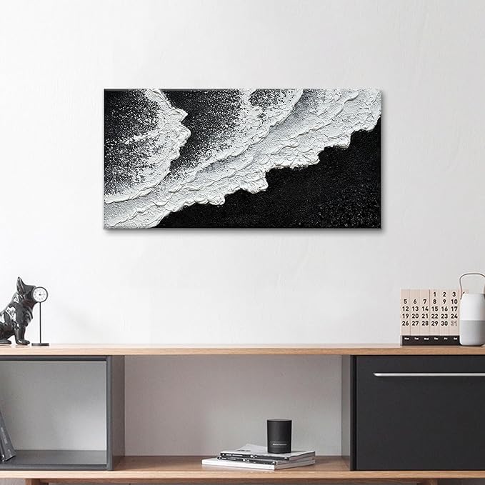 - THICK TEXTURE ACRYLIC CANVAS ART SIZE: Abstract black and white beach wave painting size 24x48inchs (60x1200 cm).
