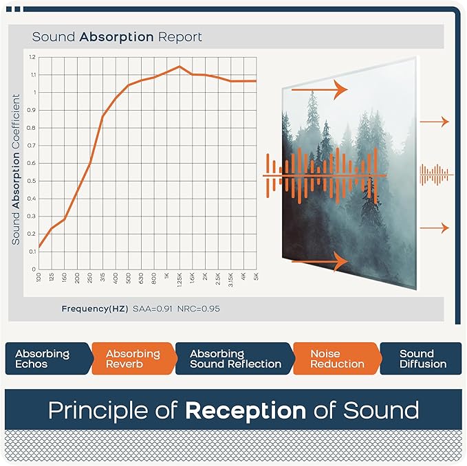 - đ»ăSound Absorbingă Our art acoustic panels which can easily and effectively reduce reverberation diffusion and echo, absorbing noise for walls. Effectively improve your sound environment and quality.Absorption Frequency: 150-20000HZ.It has better effect than acoustic foam