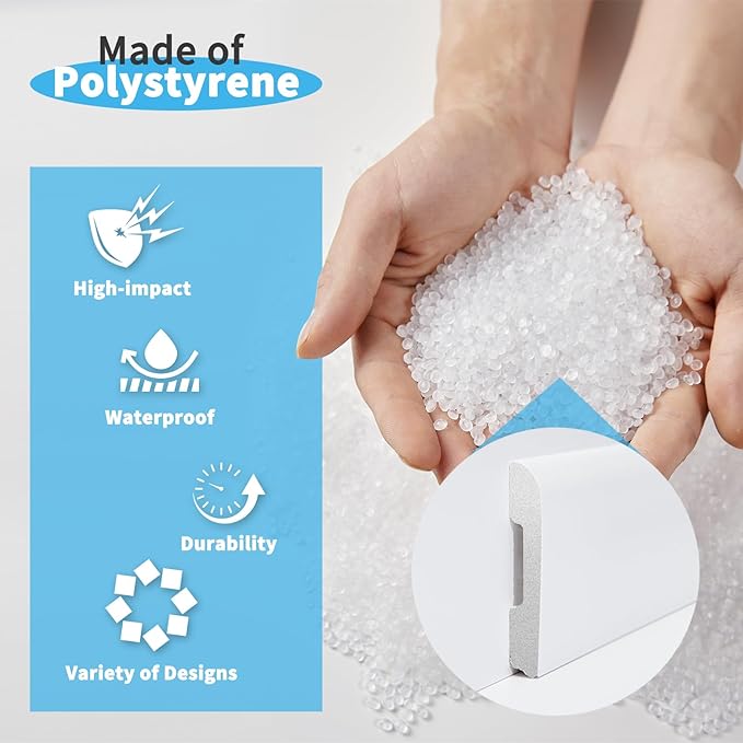 - High-Impact Polystyrene Material - Compared to flexible PVC wall baseboard molding trim, our's more stiff and sturdy that can align straightly. Also it's paintable, resistant to moisture, warping and cracking, ensuring a long-lasting, pristine finish