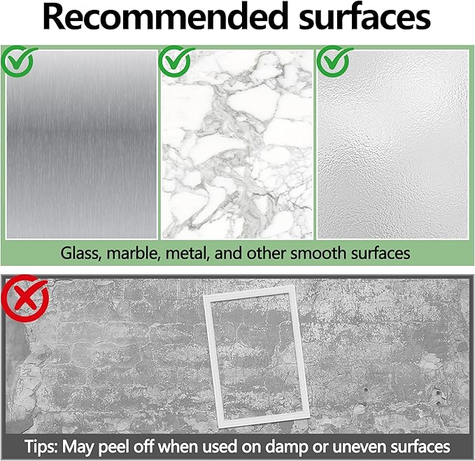 - 【Realistic Application】Ideal for sticking to perfectly smooth painted drywall, glass, metal, or sealed marble. Not recommended for lightly textured or uneven walls without additional strong adhesive