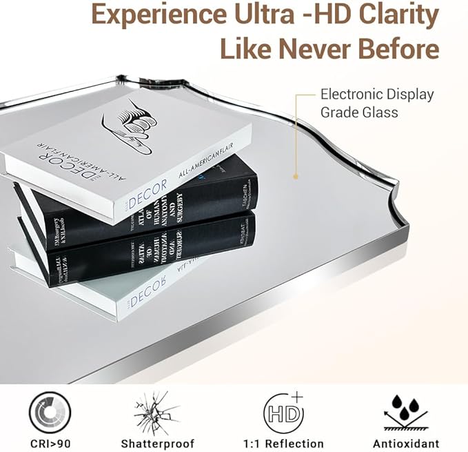 - 【Rust-Proof Stainless Steel Frame】: (N.W:17LBS). Crafted from stainless steel with oxidation-resistant properties, this chrome mirror for bathroom offers enhanced stability and a longer lifespan. Shatterproof 4mm HD glass is supported by a 9mm MDF backboard (most others just 3mm ), surrounded by a 1/17" gap with a unique curved corner design to give a seamless finish