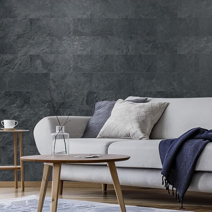 AULIGET 2-Piece Black Slate Peel and Stick Backsplash Wall Tiles, 6" x 12" PVC Faux Stone Stick on Tiles for Backsplash Kitchen, Bathroom, Laundry Room, Camper, Fireplace