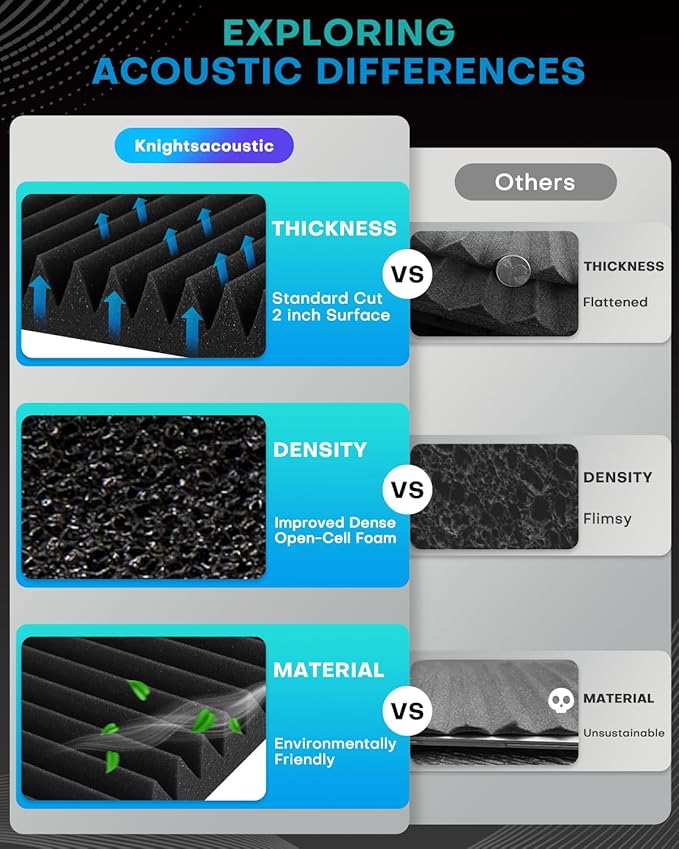 - HIGH-QUALITY SOUND MANAGEMENT – Our 2-inch high-density soundproof foam panels offer a thicker design that significantly enhances sound absorption compared to standard 1-inch acoustic foam. This increased thickness not only expands the sound contact area but also maintains the panels' performance when cut and shaped to fit your needs.