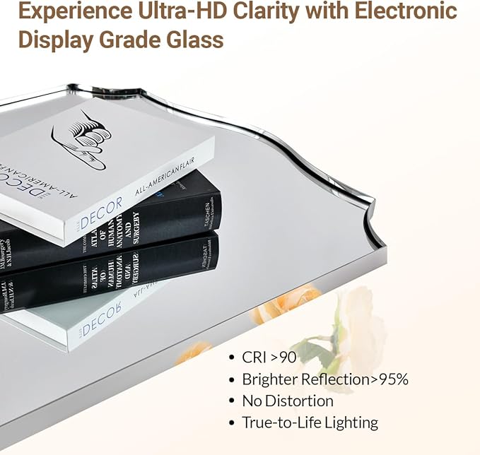 - 【Rust-Proof Stainless Steel Frame】: (N.W:21.8LBS). Crafted from stainless steel with oxidation-resistant properties, this chrome mirror for bathroom offers enhanced stability and a longer lifespan. Shatterproof 4mm HD glass is supported by a 9mm MDF backboard (most others just 3mm ), surrounded by a 1/17" gap with unique curved corner design to give a seamless finish