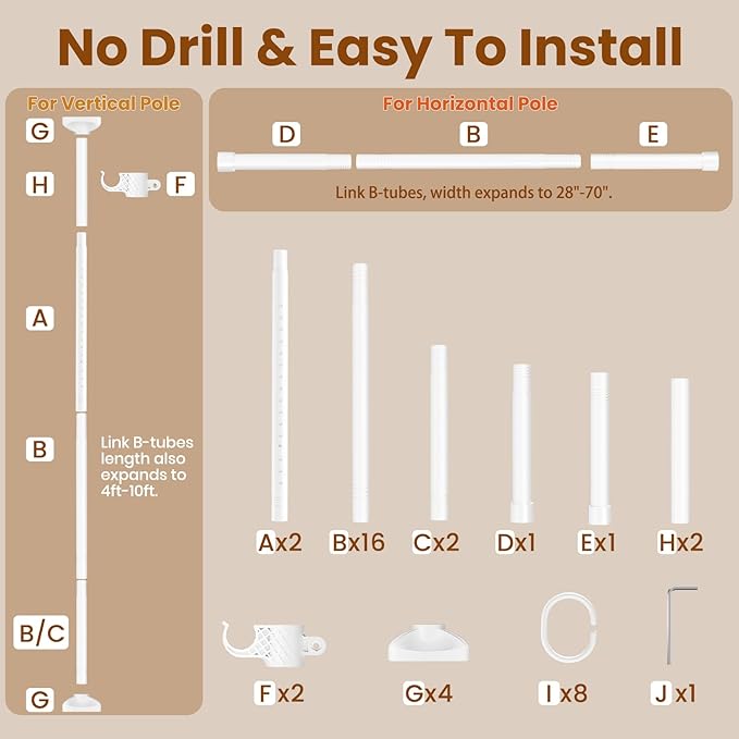 - 【Adjustable Height and Width】 Our room divider tension rod is adjustable in width (28" - 70") and height (4 - 10 ft) to match any space. You can customize the curtain rod by telescoping it or subtracting the extra rods.