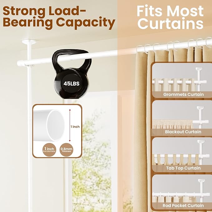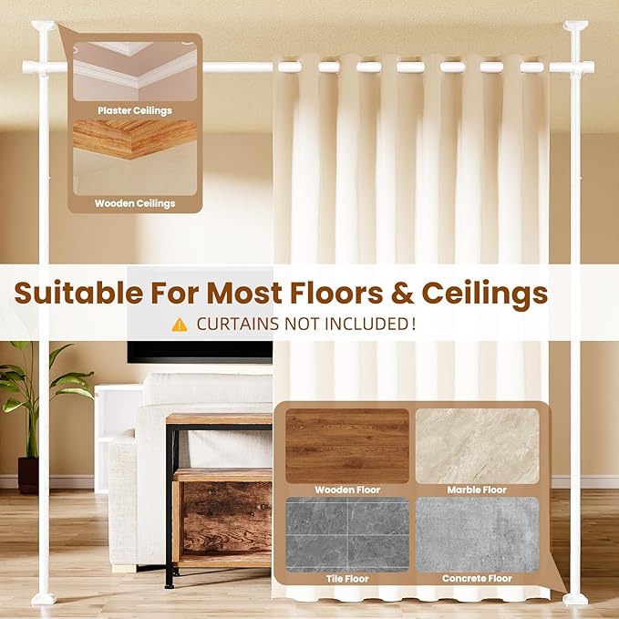 - 【Non-Damaging Desigh】This no drilling curtain rod wall divider leaves no holes or damage on walls or ceilings, an ideal solution for any hard-to-install area such as rentals, apartments, dormitories and more. Suitable for a wide range of surfaces such as wooden, marble, tile, plaster...