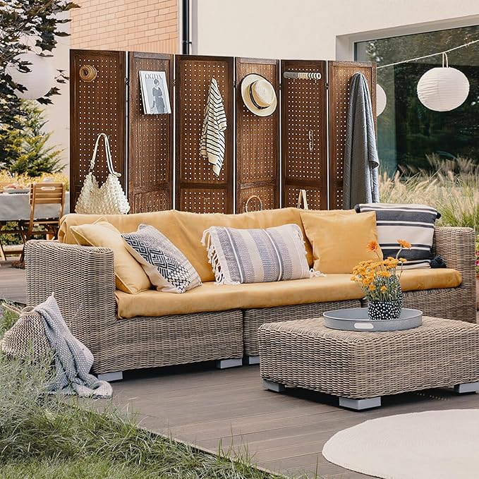 6 Panel Pegboard Display with 24 Hooks, Wood Room Divider Wall, 5.6Ft Folding Privacy Screen Divider Room, Portable Freestanding Wall Organizer for Bedroom Reading Room(Dark Brown)