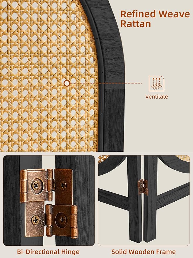 - Solid Wood Frame: The frame of the room divider is made of high-quality tung wood, which provides solid support and at the same time has a certain resistance to deformation and is durable.The 3 panel room dividers unique arched design with natural rattan adds a sense of hierarchy to the space, which is suitable for a variety of interior styles