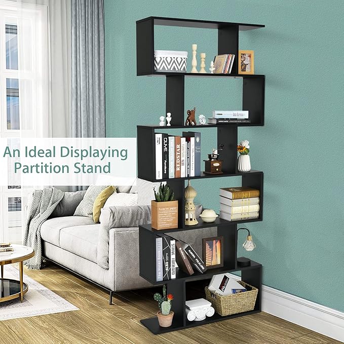 6 Tier Geometric Bookcase, S Shaped Bookshelf, Book Shelf Room Divider, Wood Freestanding Display Shelves, 75 Inch Staggered Bookshelf for Bedroom Living Room (1, Black)