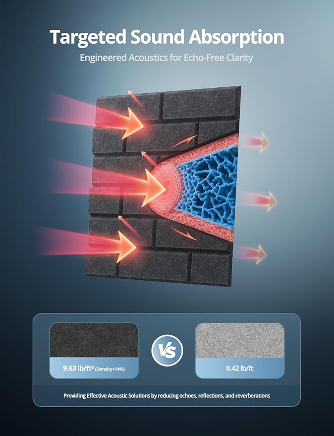 - Experience Better Audio: Acoustic panels reduce echo and reflections by absorbing stray sound waves in the room. Whether relaxing, recording, or gaming, our panels improve clarity and reduce noise, providing mild soundproofing for a calmer home.
