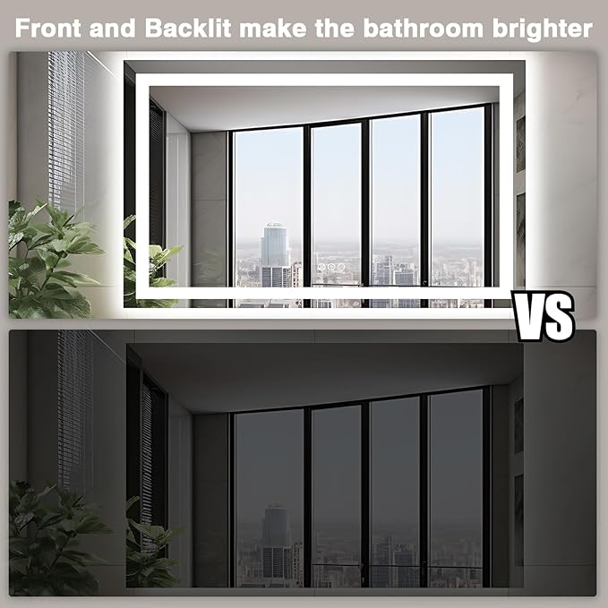 - [Anti-Fog & Water-Proof] Say goodbye to foggy mirrors! Our LED bathroom mirror includes a built-in defogger, ensuring your reflection stays clear even after steamy showers. Plus, the defogger and light strip are waterproof, providing you with safe lighting in wet conditions.