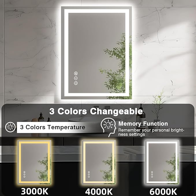 - [Anti-Fog & Water-Proof] Say goodbye to foggy mirrors! Our LED bathroom mirror includes a built-in defogger, ensuring your reflection stays clear even after steamy showers. Plus, the defogger and light strip are waterproof, providing you with safe lighting in wet conditions.