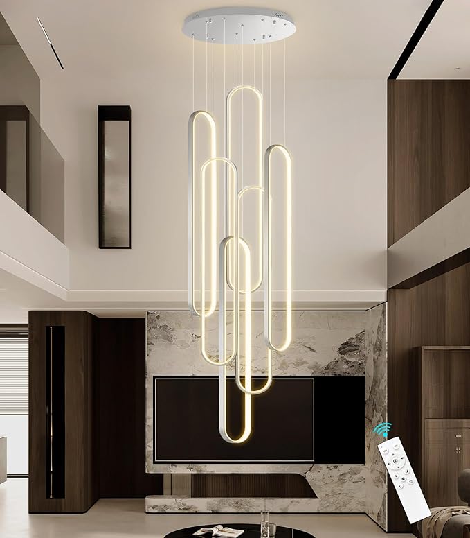 - 【Staircase Chandelier Dimension】Each ring W7.9", Length up to 40", with W23.6" canopy, 138" adjustable hanging wires. High quality aluminium, Highly translucent silicone lampshade better light transmission and heat dissipation and creates a warm atmosphere