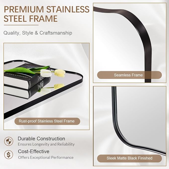 - 【Premium Stainless Steel Craftsmanship】: (N.W: 34.2LBS). Crafted from stainless steel metal with oxidation-resistant properties, this 30x48 matte black irregular mirror offers enhanced stability and a longer lifespan