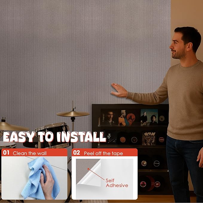 - đťăEASY INSTALLATIONă Super easy to install! With the self-adhesive design, you just need to tear off the top liner on the back and stick the sound proofing panels to the wall.