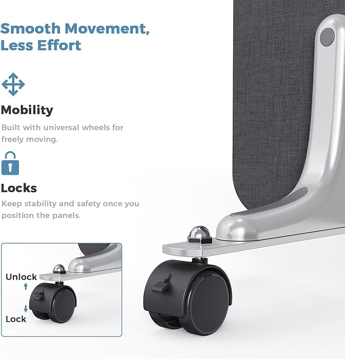 - Smoothly Mobility: Mobility is key in dynamic work environments, and our partition walls are equipped with 12 self-locking universal wheels that make repositioning a breeze. Once you have the partitions in the desired position, simply engage the locking mechanism to secure them in place, ensuring stability and safety. This feature is particularly beneficial for flexible workspaces, allowing you to easily reconfigure your layout for various activities and events.