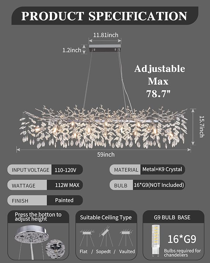 - Light source requirements: Not including light bulbs, 16 G9 bulbs are required. It is recommended to use warm white light. Dimmer light can be dimmed with dimmer switch when using dimmer light bulb