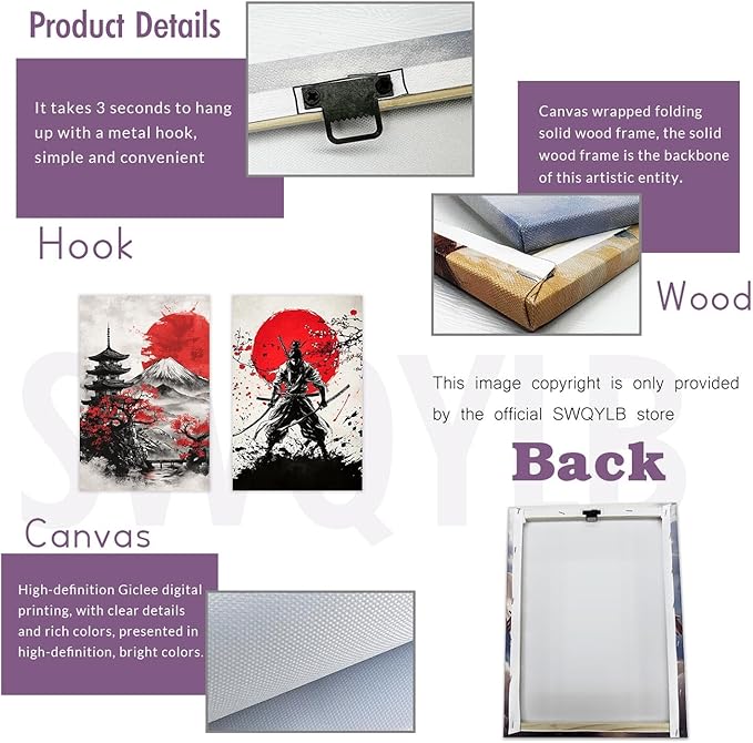- Japanese framed: this Japanese painting has been assembled. The design of the canvas surrounding the solid wood frame makes this artwork more beautiful and three-dimensional. It is simple and convenient to hang. You can hang it as soon as you receive it.