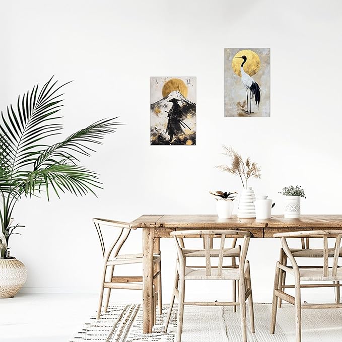 SWQYLB Japanese Wall Art 2 Piece Samurai Art Wall Decor Japanese Landscape Pictures Canvas Prints Asian Oriental Home Decor Framed (Gold, (12"x16"x2 Pieces))