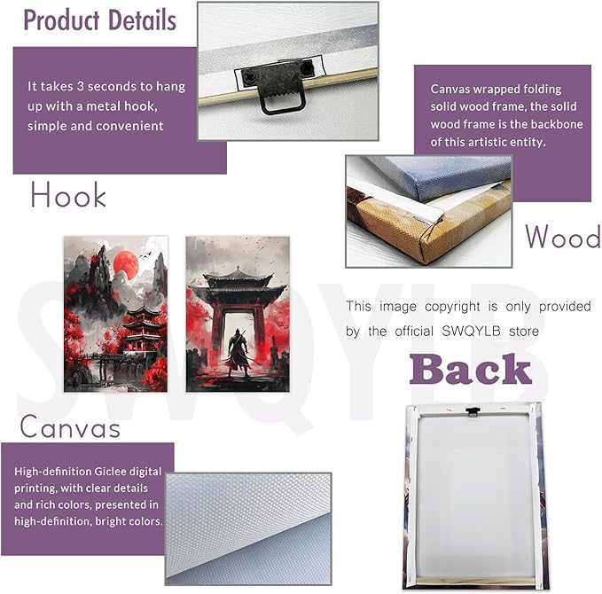 - Japanese framed: this Japanese painting has been assembled. The design of the canvas surrounding the solid wood frame makes this artwork more beautiful and three-dimensional. It is simple and convenient to hang. You can hang it as soon as you receive it.