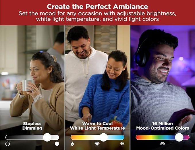 - FULL COLOR RANGE FOR A BALANCED ATMOSPHERE: Tailor your lighting by selecting warm to cool white light (3000K/ 4000K/5000K) , or pick a range of 16 million vivid colors to suit your mood. Stepless dimming and a variety of custom modes allows you to set the perfect scene for any occasion.