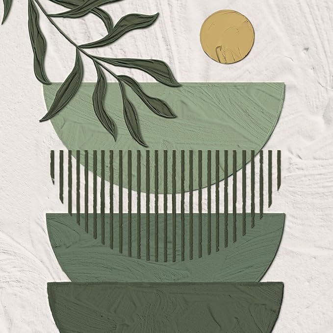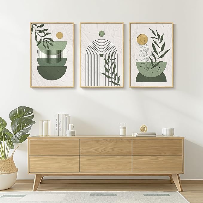 - [As Good As The Picture]: This set of paintings mainly uses natural tones such as green and beige to create a unique visual effect through geometric shapes and plant elements, giving a harmonious and cozy feeling. Perfect for wall decoration in living room, hallway, bedroom, dining room, kitchen, study, office, bathroom, hotel, bar and other scenes