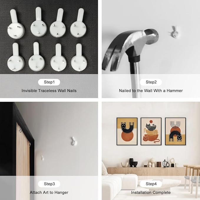 - [Mural Material] This boho cat picture set is printed on high quality durable canvas with sturdy black frame and wooden backing that won't fade, waterproof and UV resistant. Hooks are mounted on each panel,included non-marking nails, and the simple hanging energizes the room!