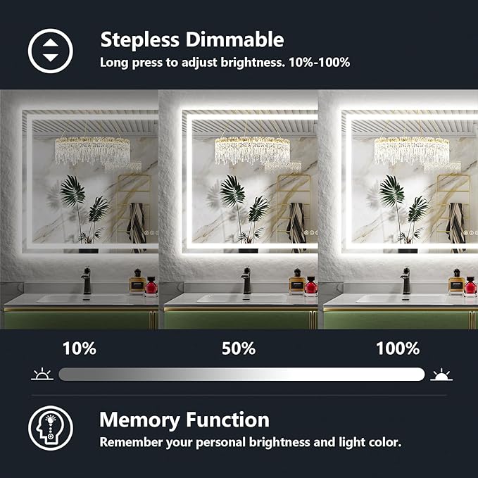 - â¨ăColor Changeable & Brightness Adjustable & Memoryă- Yeelait lighted mirrors for bathroom wall features multiple light settings that are easily controlled with sensitive touch buttons. Short press the button to change the light color: White (6000K) - Neutral (4000K) - Warm(3000K), long press the button to dim the brightness to your comfortable level (100%~10%). The Smart Memory Function will record the lighting setting and keep the previous lighting status after turning off and on.