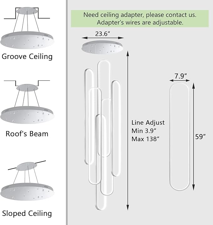- 【Staircase Chandelier Dimension】Each ring W7.9", Length up to 59", with W23.6" canopy, 138" adjustable hanging wires. High quality aluminium, Highly translucent silicone lampshade better light transmission and heat dissipation and creates a warm atmosphere