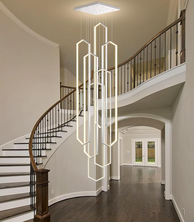 - 【Unique Rhombic Design】This chandelier features six 59'' rhombic ring that gracefully drop down from the ceiling plate. The minimalist lines of the design, the huge chandelier illuminate a large area without taking up too much space, which can complement various home styles