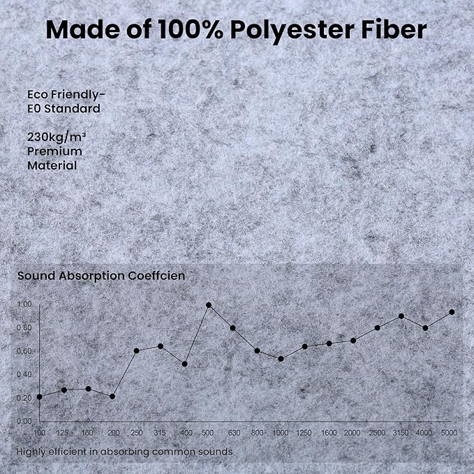 - 100% Polyester Fiber - The wall soundproofing panels is carefully made of 100% polyester fiber. Polyester fiber large acoustic panels have many advantages, such as excellent sound absorption, effective resistance to moisture and mildew, easy to cut,good stability, and has a high cost-effective.