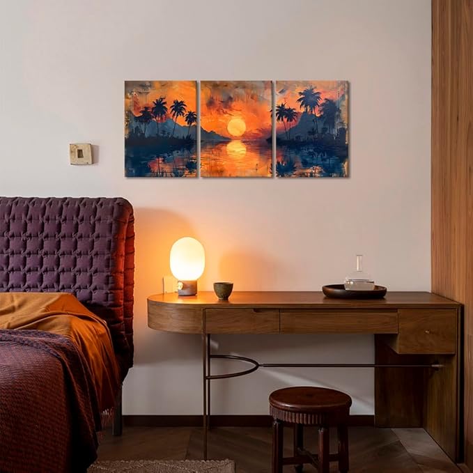 MAMAGO Sunset Beach Wall Art Tropical Palm Trees Canvas Print Picture Oil Painting Style Coastal Landscape Living Room Bedroom Bathroom Wall Decor Framed Easy to Hang-12”W x 16”Hx3pcs