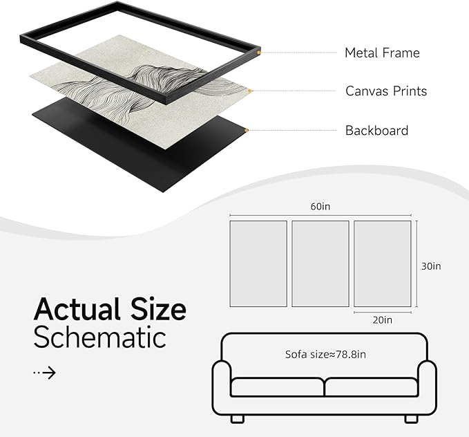 - [Framed Wall art]: A set of 3 large contemporary minimalist black and white abstract line wall art each 20x30 inches, 3 pieces totaling 30" H x 60" W. The frame is sturdy and the simple and stylish black frame blends perfectly with a variety of decorative styles